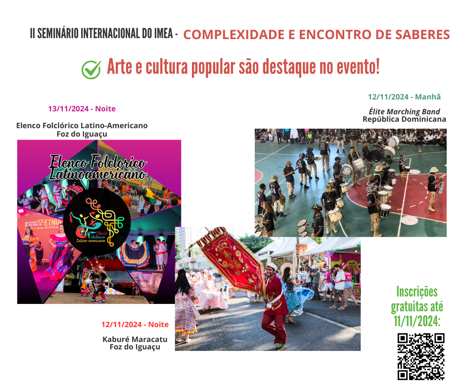 Nos dias 12 e 13 de novembro, no Auditório Martina (C 309), as inscritas e os inscritos no II Semináro Internacional do IMEA - Complexidade e Encontro de Saberes terão a oportunidade de desfrutar de diferentes apresentações latino-americanas e caribenhas: