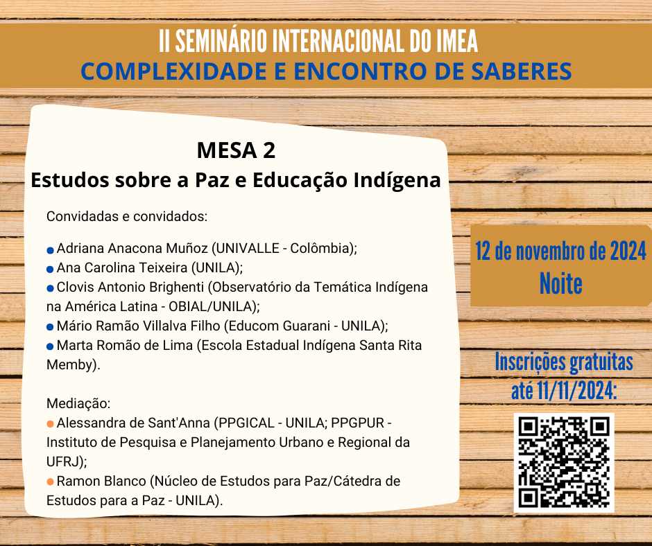 No dia 12/11, a partir das 19h, no Auditório Martina (C 309), localizado no Prédio Central da Unidade Jardim Universitário da UNILA, ocorrerá a segunda Mesa do II Seminário Internacional do IMEA.